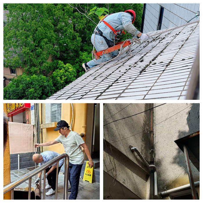 8月安全巡查期間,綜合服務(wù)中心安全科針對紡織南路7號樓及周邊區(qū)域開展專項隱患排查,發(fā)現(xiàn)兩處亟待處理的安全問題:一是7號樓公廁外側(cè)落水管多處破裂,導(dǎo)致雨水滲漏至路面并形成大面積積水,不僅影響市容環(huán)境,更對過往車輛及行人構(gòu)成潛在風(fēng)險;二是慶達(dá)綜合樓頂層臨街面瓷磚多處開裂,縫隙中滋生的灌木根系已侵入建筑結(jié)構(gòu),存在高空墜物隱患,嚴(yán)重威脅公共安全。